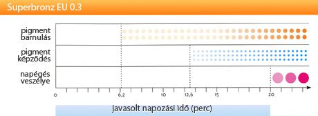 Ebből az ábrából kitűnik, hogy a biztonságos napozás a 0.3-as gépekkel érhető el, mivel a bőrpirosság, bőrégés csak 20 perc után jelentkezik. De a barnasághoz és az új pigmentek létrehozásához is 10-15 percet kell napozni.
